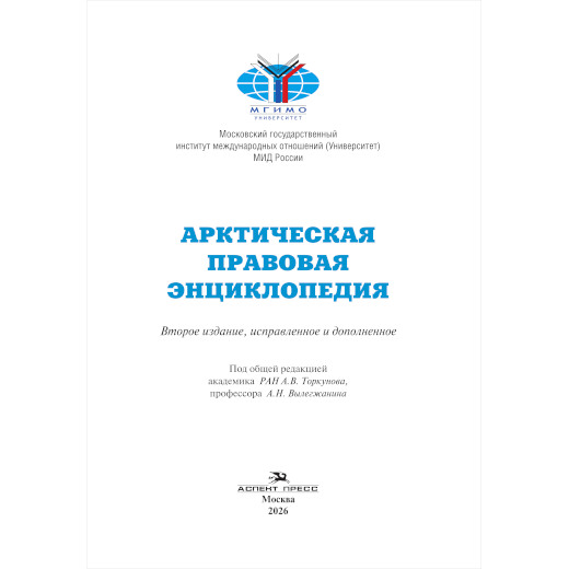 В основу первой в мире «Арктической правовой энциклопедии» положен, прежде всего, Сборник правовых документов о статусе Арктики, подготовленный учеными МГИМО МИД России и Российского совета по международным делам в 2011–2012 гг., изданный в 2013 г. на русском языке (Арктический регион: проблемы международного сотрудничества: Хрестоматия: В 3 т. Т. 3: Применимые правовые источники / Гл. ред. И.С. Иванов; научн.-юрид. ред. А.Н. Вылегжанин. М., 2013. — 661 с.). Эта книга была переведена в 2015 г. на китайский язык и издана в Китайской Народной Республике. На такой научной платформе в 2019 г. собрание правовых документов об Арктике было пополнено и обновлено в вышедшей в свет в Швейцарии (на английском языке) книге: Berkman P., Vylegzhanin A., Young O. Baseline of Russian Arctic Laws. Springer, 2019. XXXIX — 734 p. При подготовке настоящей «Арктической правовой энциклопедии» вновь обновлен и пополнен перечень источников, составляющих статус Северного полярного региона, особенно в части Арктической зоны Российской Федерации и документов Арктического совета.